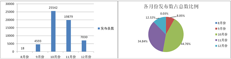 2014年8月份至12月份期间,本站共发布57062条宣讲会行程信息。其中,8月份发布18条,占总数的0.03%;9月份发布4593条,占总数的8.05%;10月份发布25542条,占总数的44.76%;11月份发布19879条,占总数的34.84%;12月份发布7030条,占总数的12.32%。