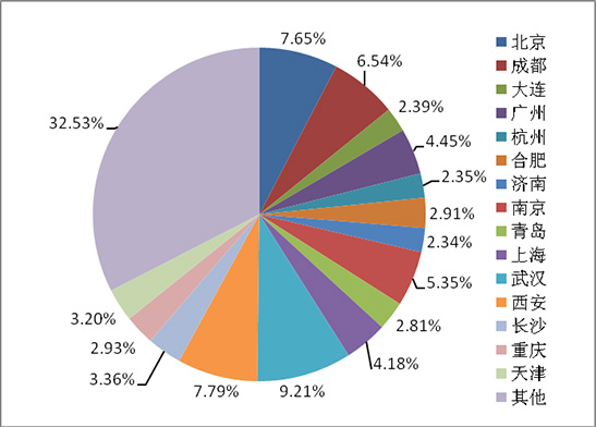 自2014年8月份至12月份期间,把33个地区区域细分为以城市为单位,本站发布的宣讲会行程信息共涵盖了174个城市。抽出其中15个发布宣讲会条数最多的城市,包括北京、成都、大连、广州、杭州、合肥、济南、南京、青岛、上海、武汉、西安、长沙、重庆和天津,这15个城市总计发布条数占发布总数的67.47%。