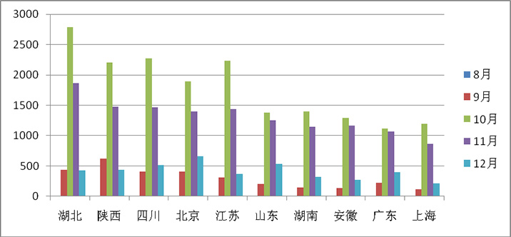 宣讲会发布时间自2014年8月至12月,包括的33个地区区域按每个月的宣讲会发布数分析,均呈现出图1中表示的趋势,即10月、11月发布条数达到高峰,10月份最多。 在33个地区区域中,抽出排在前10位的地区区域,按照各个月的发布情况,绘制成如下。其他地区区域各个月的发布情况与此类似。