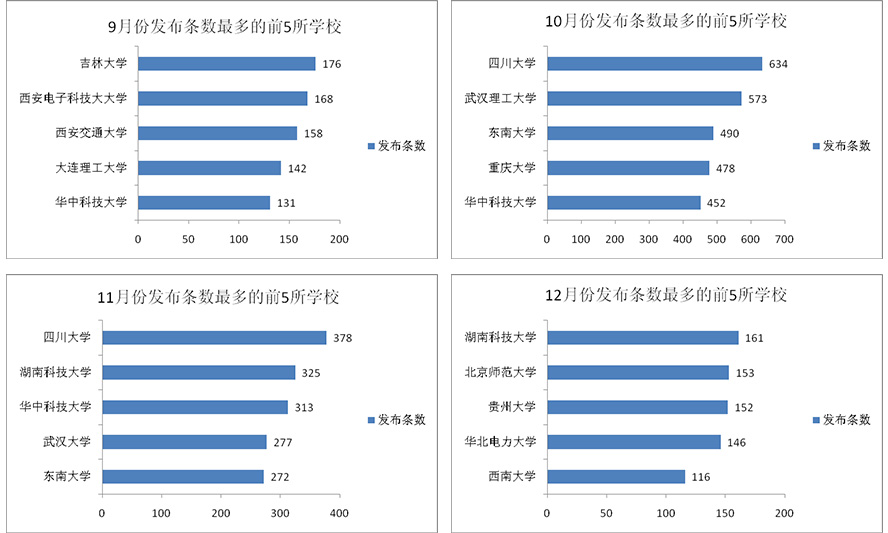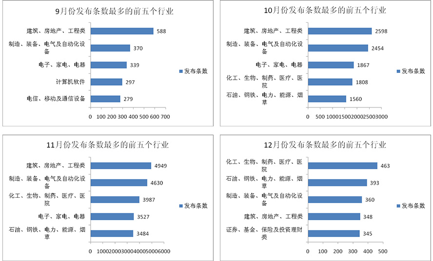 各行业在2014年8月至12月期间各个月的发布情况亦呈现出图1中表示的趋势,在10月份达到最多发布数。由于8月份只有零星的几场宣讲会,其他宣讲会主要集中在9月份至12月份。故下面将列出自9月份开始每月宣讲会发布最多的前5个行业。
