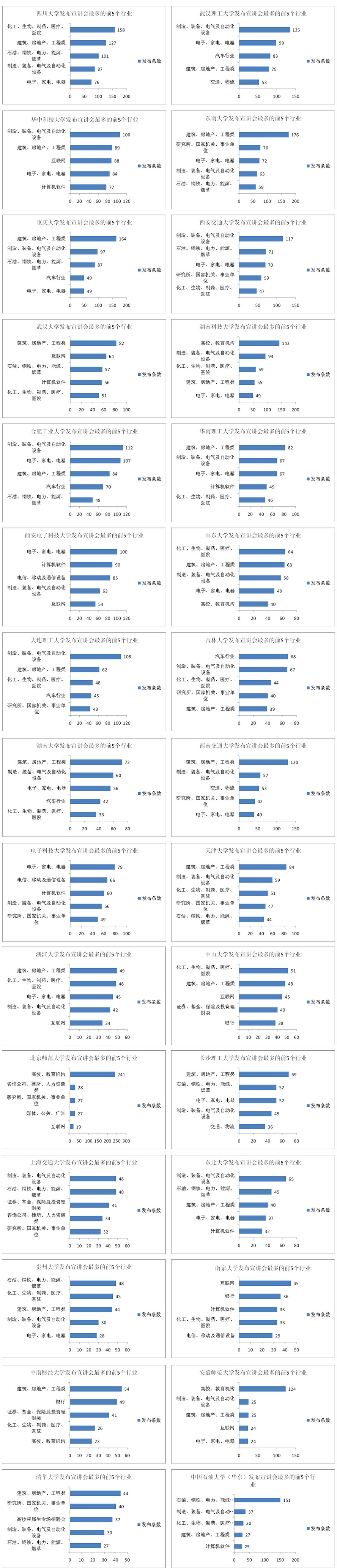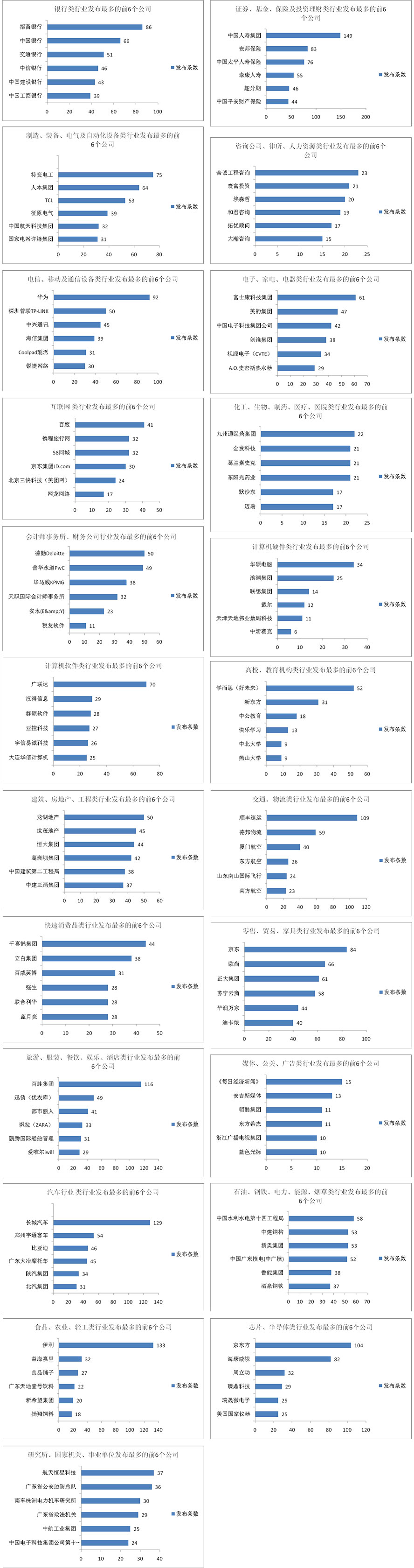 由于不同的公司所属不同的行业,为了更清晰的表示出在某一行业中有哪些公司发布过较多的宣讲会信息。以下将列出在每一行业中发布最多的前6个公司。