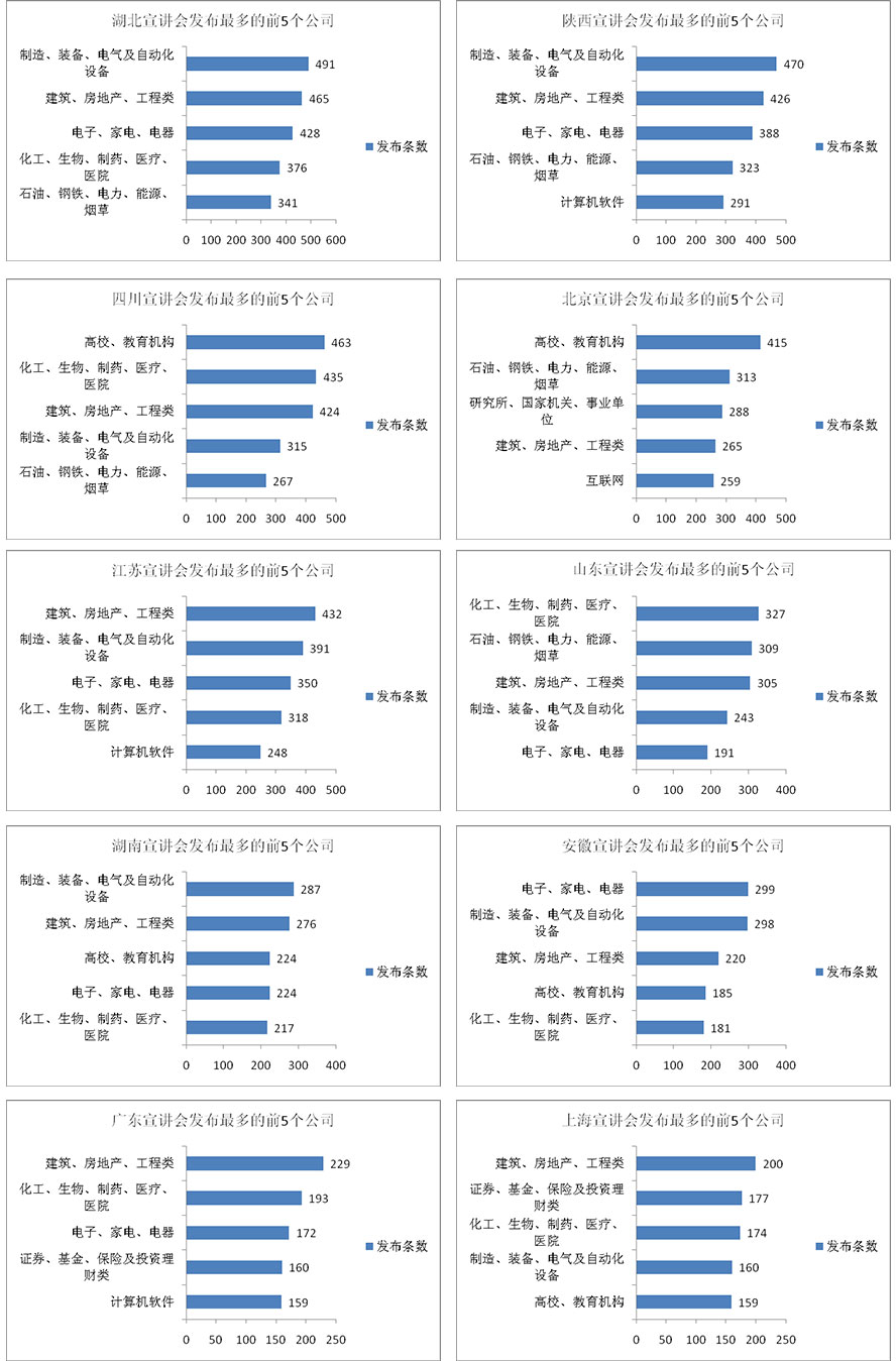 以下分析了前10个地区区域发布的宣讲会在行业方面的分布情况。各地区区域列出了发布最多的前5个行业。